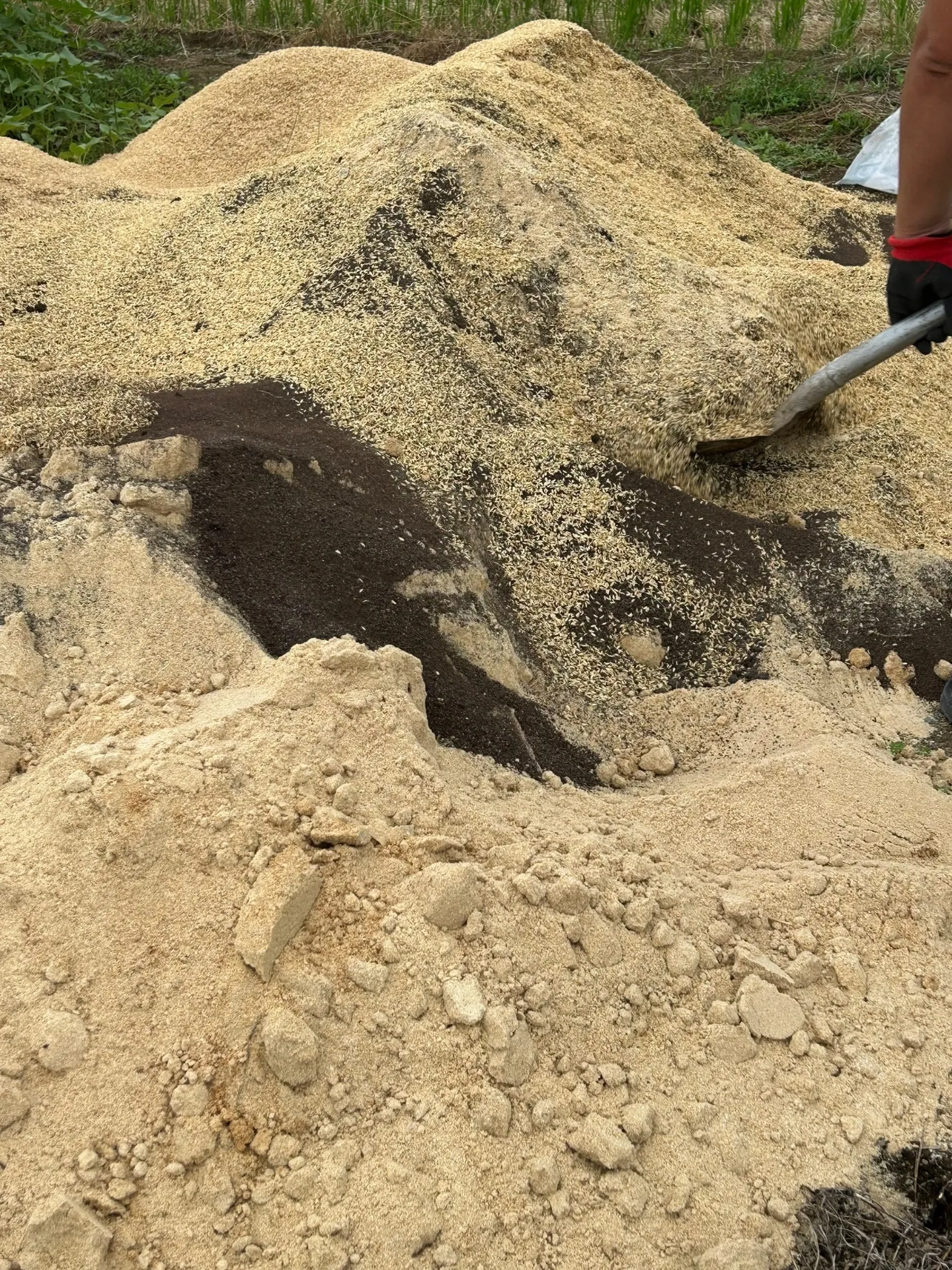 鶏糞には豊富な窒素分、籾殻には通気性と保水性、そして米ぬかには発酵を促す酵素や栄養素が含まれています。これらをバランスよく混ぜ合わせることで、微生物が活発に働き、自然の力でじっくりと分解・熟成が進みます。